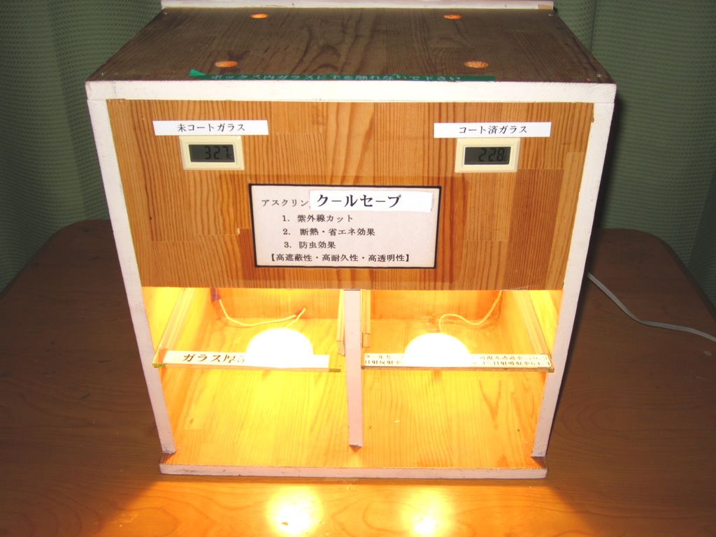 100Wのレフ球ランプを入れた温度比較ボックスによる比較実験(左側:未コート5ミリ厚ガラス 右側:試験対象ガラス)
